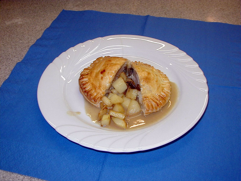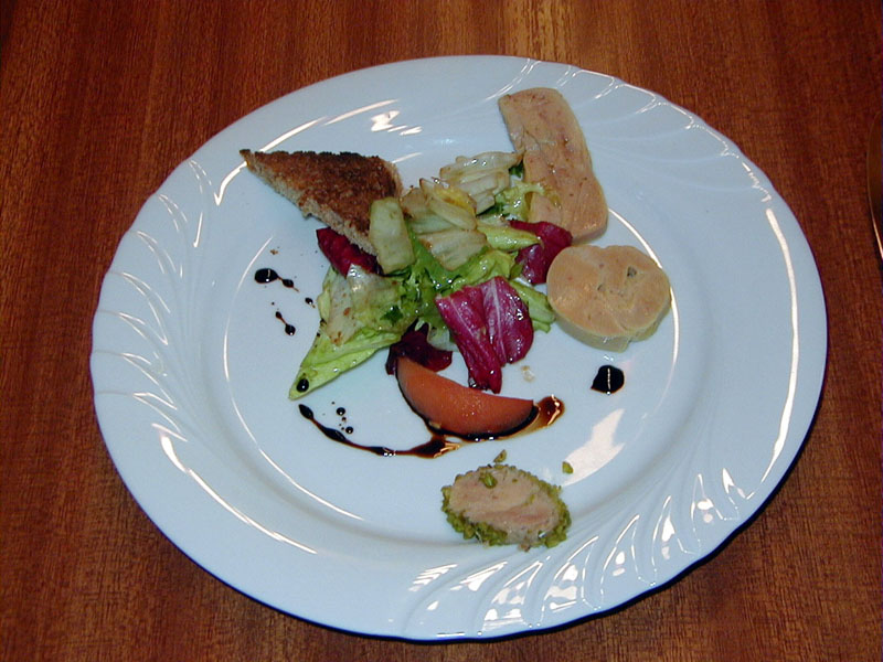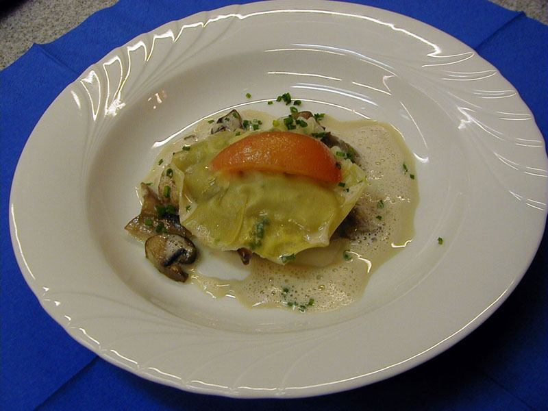 Raviole de magret fumé et de foie gras, champignons des bois et beurre fondu |